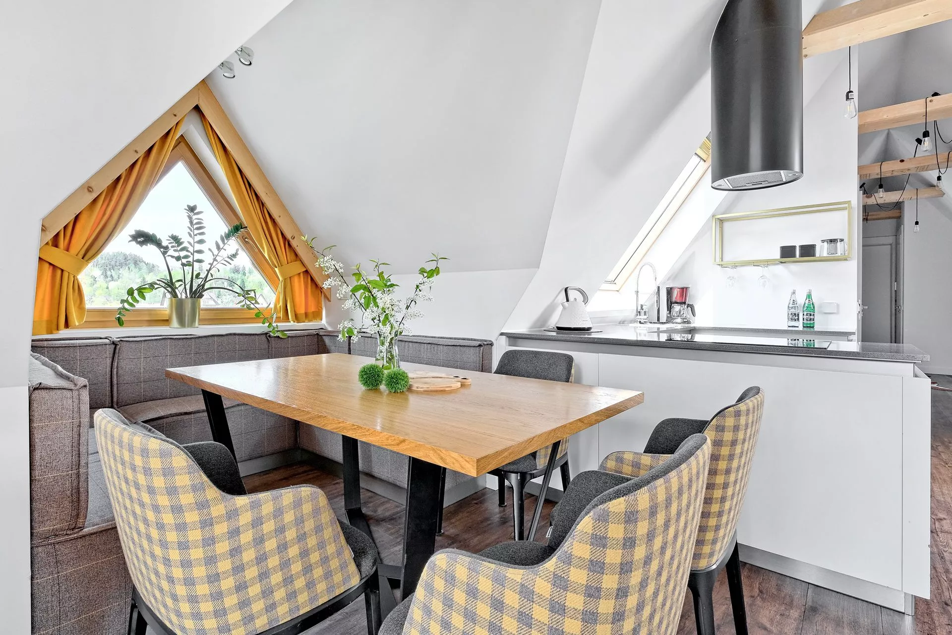 Apartament Superior składa się z przestronnego salonu połączone z aneksem kuchennym, przedpokoju, łazienki, dodatkowej toalety oraz dwóch sypialni. Dzięki licznym przeszkleniom salon jest pełny naturalnego światła. Salon w stonowanych barwach z elementami drewnianymi wyposażony został w stół z krzesłami, TV, rozkładaną sofę 2 osobową oraz łóżka podwójnego. Bezpośrednio z salonu można wyjść na balkon i cieszyć się widokiem na okolicę. Sypialnie wyposażone zostały w łóżka podwójne, co zapewnia wygodny sen po całym dniu spędzonym na zwiedzaniu okolicy. W kuchni znajdują się wszystkie niezbędne urządzenia oraz akcesoria. Wyposażona w lodówkę, zmywarkę, płytę elektryczną, kuchenkę mikrofalową, czajnik bezprzewodowy, ekspres do kawy oraz komplet naczyń i sztućców. Łazienka wyposażona w kabinę prysznicową, umywalkę, WC, suszarkę do włosów, ręczniki oraz zestaw kosmetyków. Apartament idealny dla 8 osobowej rodziny lub grupy przyjaciół. Rezydencja Diamond jest perfekcyjną bazą wypadową dla miłośników jazdy na rowerze, zwłaszcza dla tych, którzy chcą odkrywać urokliwe trasy wzdłuż Dunajca i w okolicach jeziora Czorsztyńskiego, znane jako Velo Dunajec i Velo Czorsztyn.
