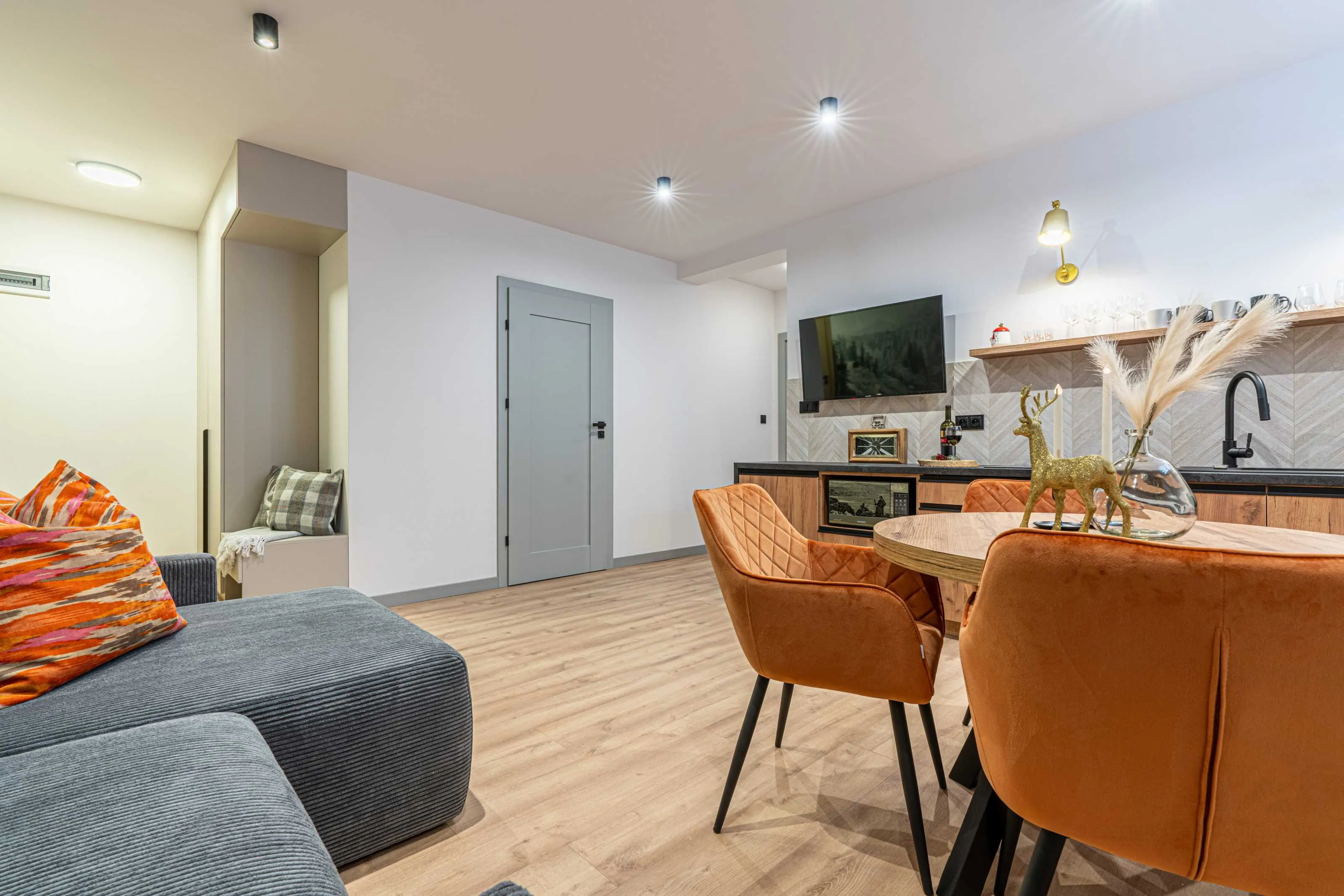 Aneks kuchenny: nowoczesna zabudowa kuchenna z lodówką, płytą indukcyjną, zmywarką, zlewozmywakiem. Wyposażony w czajnik, mikrofalówkę, garnki, patelnie i zastawę stołową dla 6 osób.
