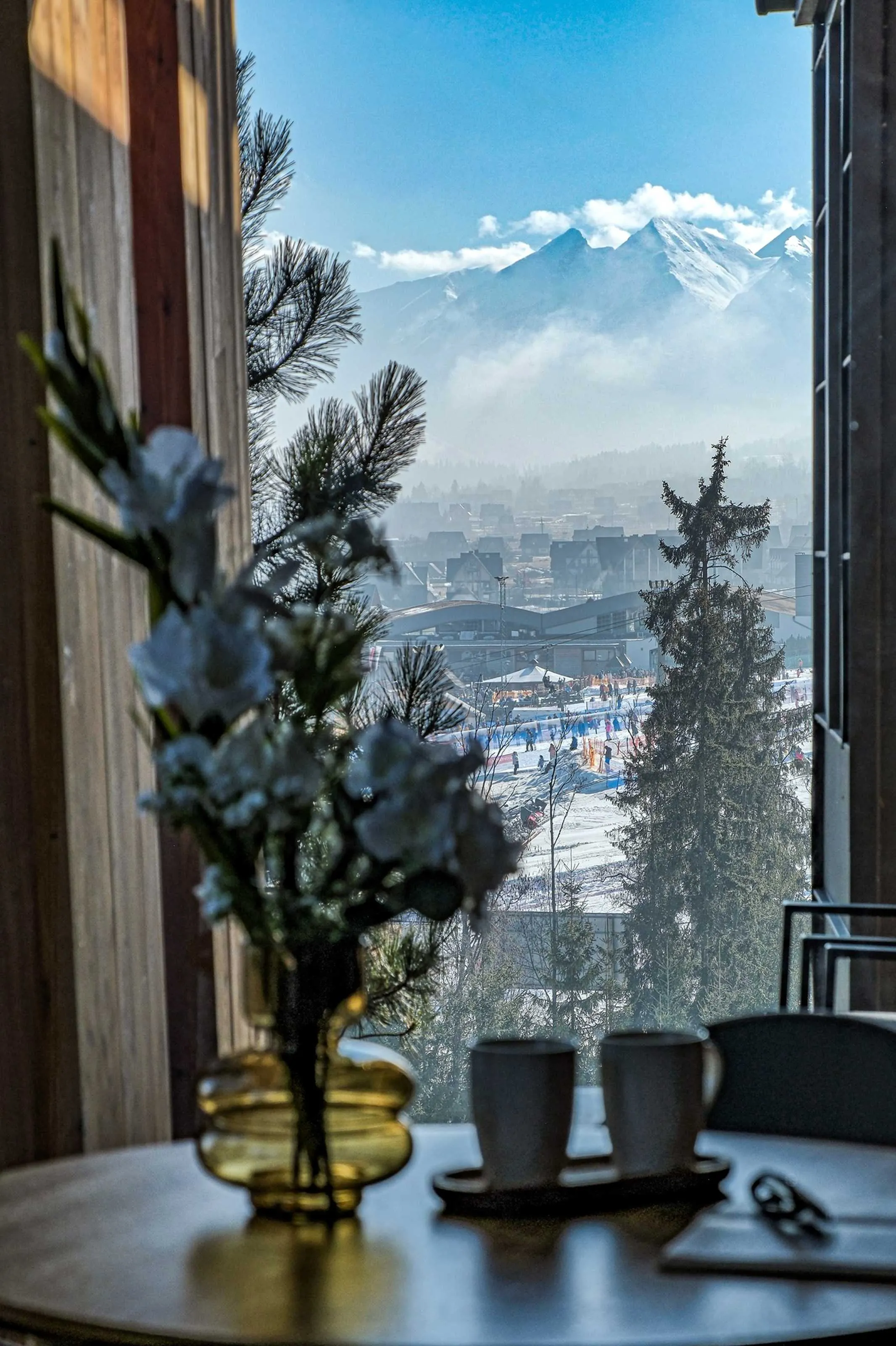 Salon: stół, krzesła, wyjście na przestronny taras z widokiem na góry oraz okolicę Białki Tatrzańskiej.